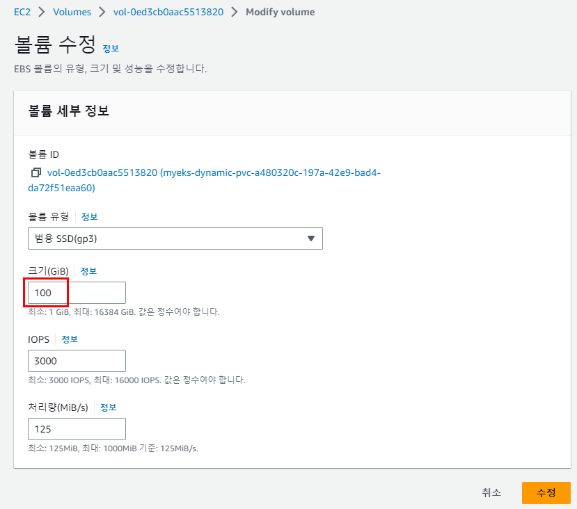 # 확인 : 볼륨 용량 수정 반영이 되어야 되니, 수치 반영이 조금 느릴수 있다