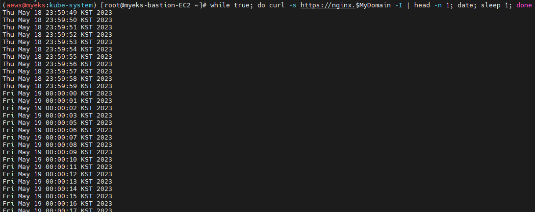 while true; do curl -s https://nginx.$MyDomain -I | head -n 1; date; sleep 1; done