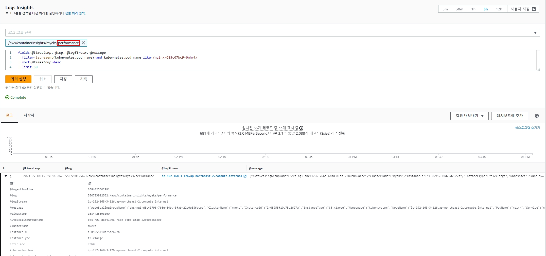 # 로그 그룹 선택 : /aws/containerinsights/<CLUSTER_NAME>/performance