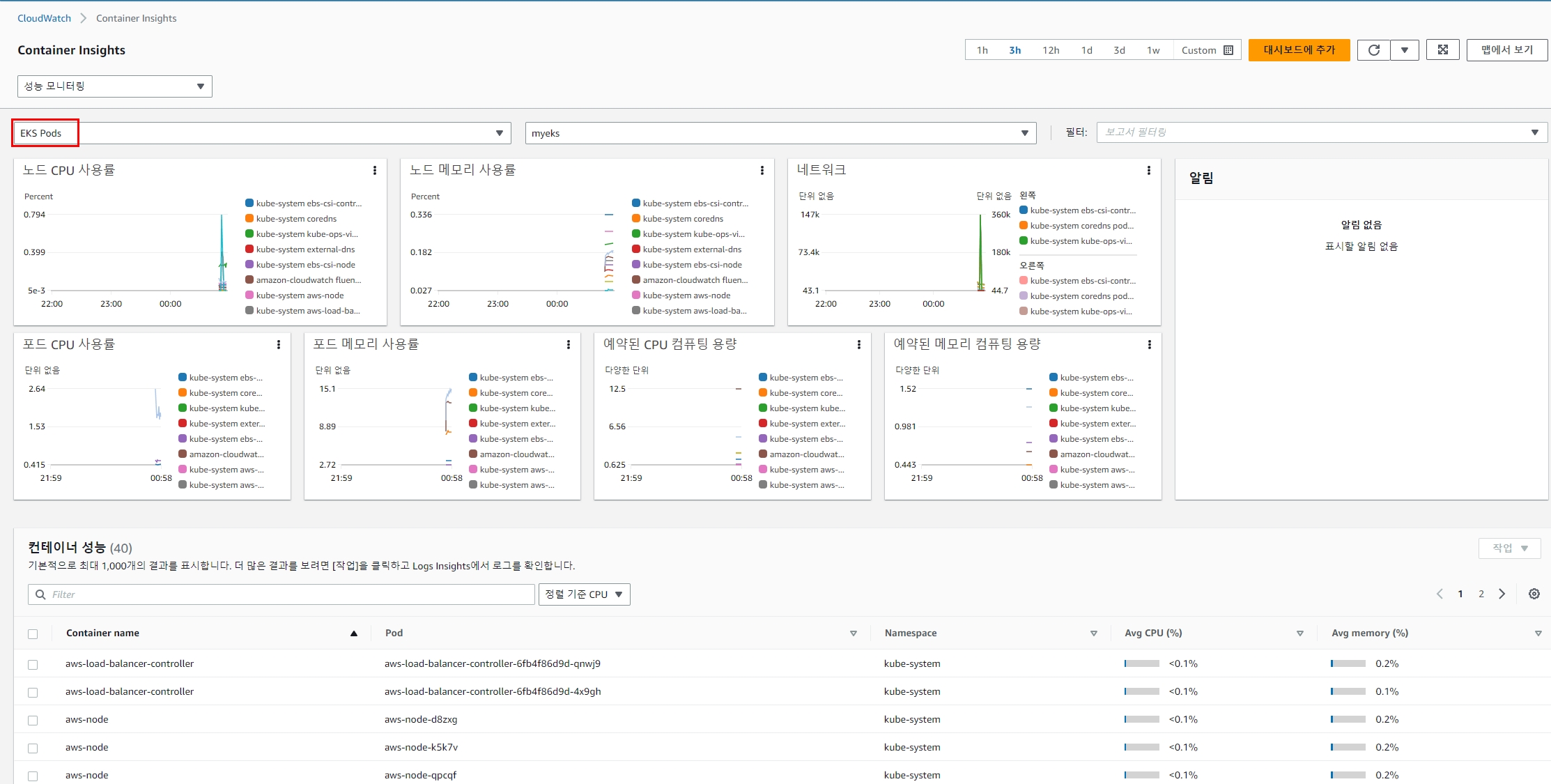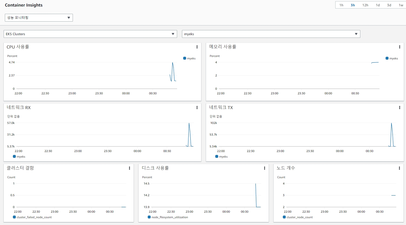 메트릭 확인 : CloudWatch → Insights → Container Insights : 우측 상단(Local Time Zone, 30분) ⇒ 리소스 : myeks 선택