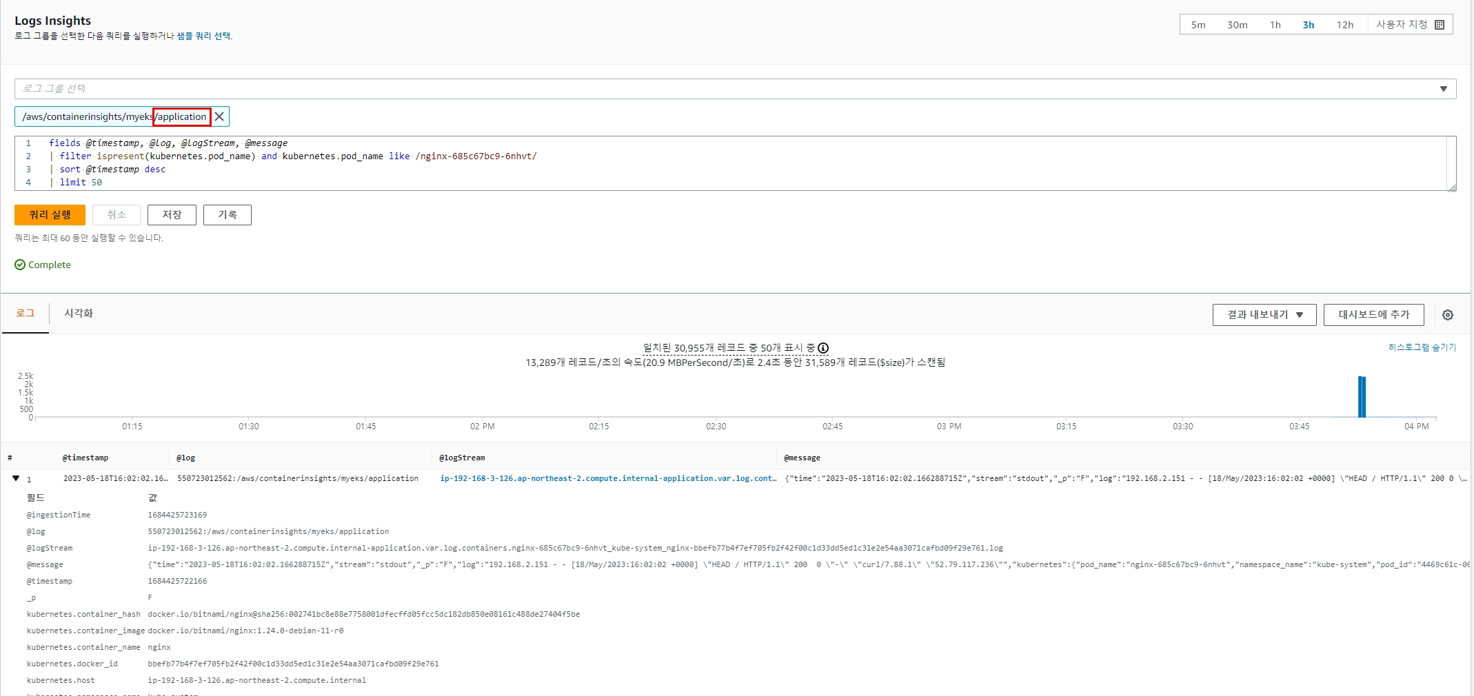 # 로그 그룹 선택 : /aws/containerinsights/<CLUSTER_NAME>/application