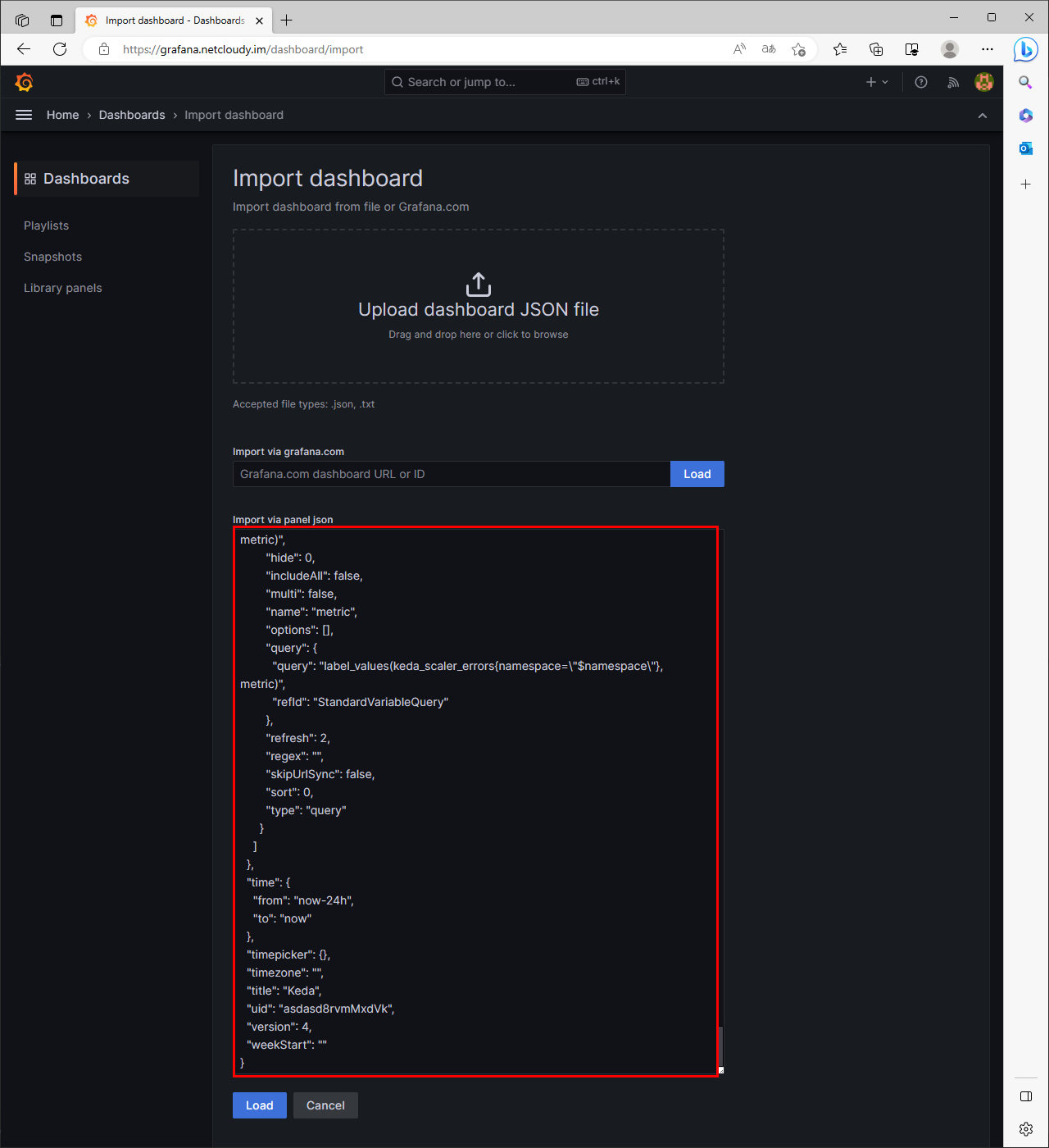 그라파나 대시보드 import 에서 json칸에 붙여넣기