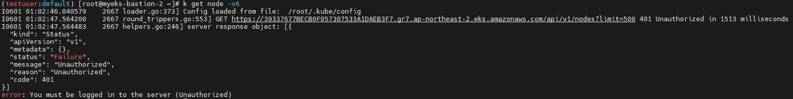 - [myeks-bastion] testuser 의 Group 변경(system:masters → system:authenticated)으로 RBAC 동작 확인