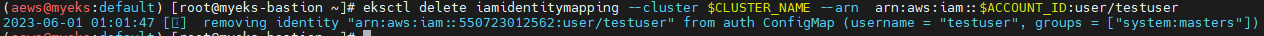 eksctl delete iamidentitymapping --cluster $CLUSTER_NAME --arn arn:aws:iam::$ACCOUNT_ID:user/testuser
