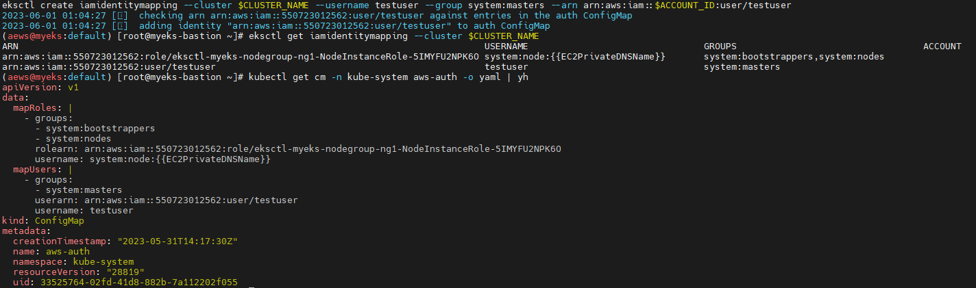 eksctl create iamidentitymapping --cluster $CLUSTER_NAME --username testuser --group system:masters --arn arn:aws:iam::$ACCOUNT_ID:user/testuser