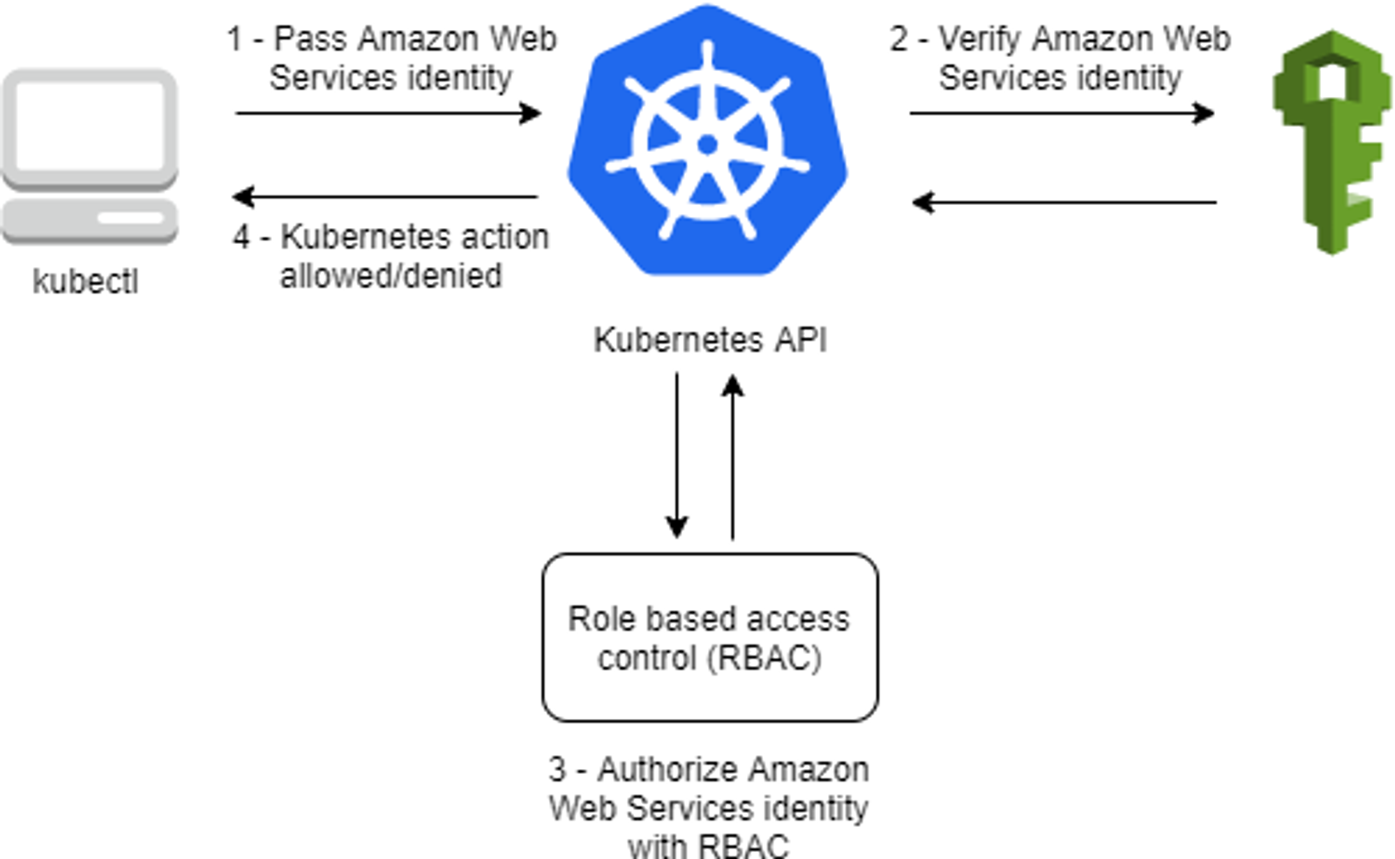 EKS API는 Token Review 를 Webhook token authenticator에 요청 ⇒ (STS GetCallerIdentity 호출) AWS IAM 해당 호출 인증 완료 후 User/Role에 대한 ARN 반환