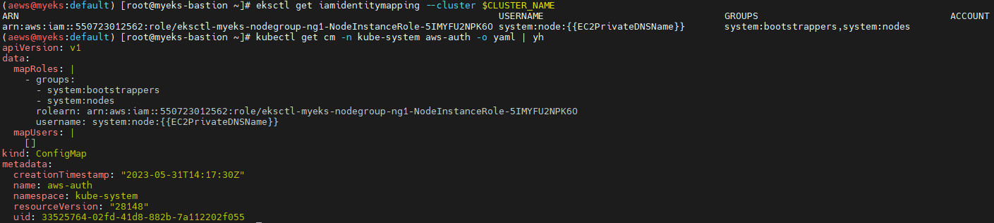 rolearn: arn:aws:iam::911283464785:role/eksctl-myeks-nodegroup-ng1-NodeInstanceRole-LHQ7DWHQQRZJ