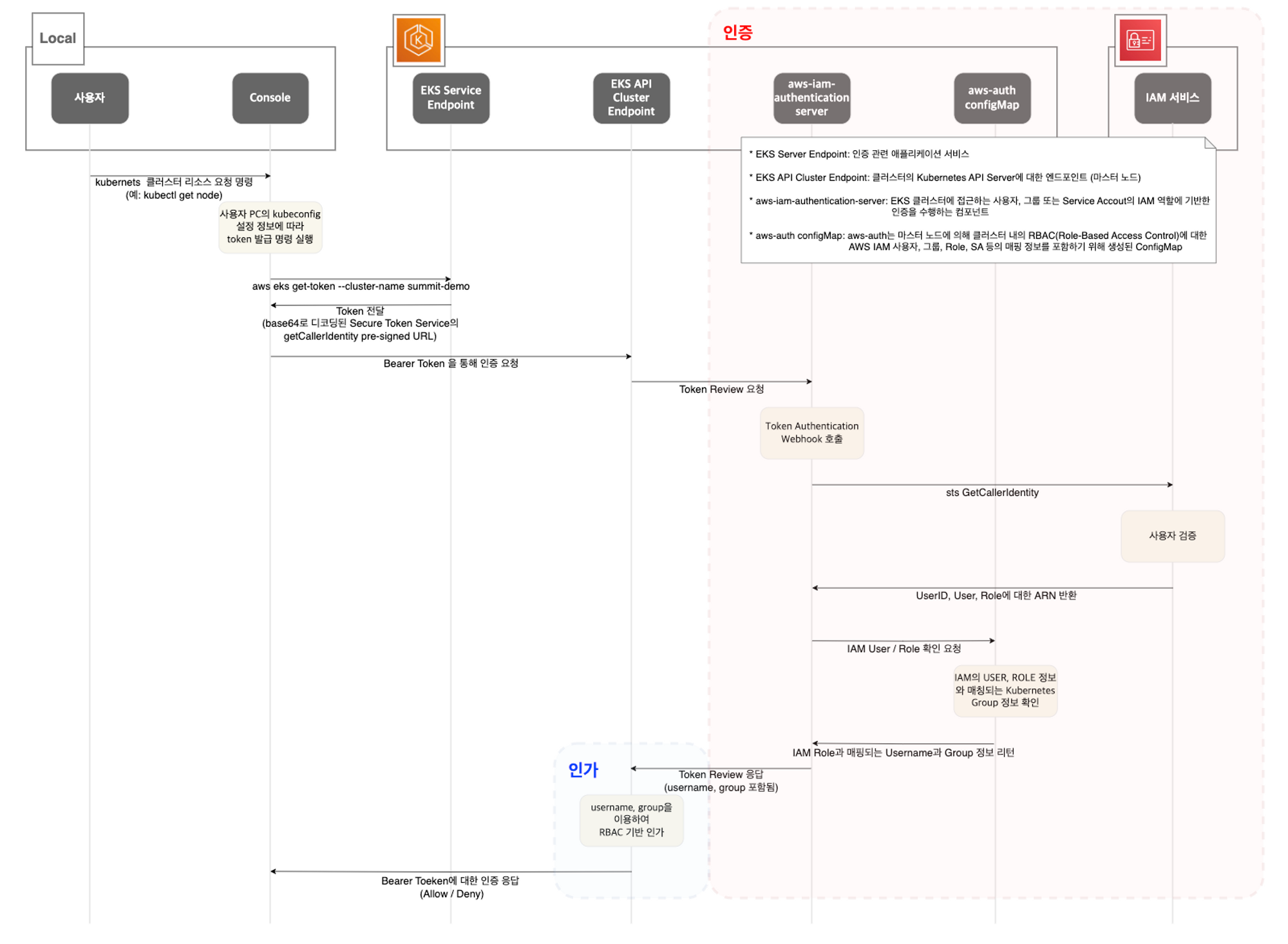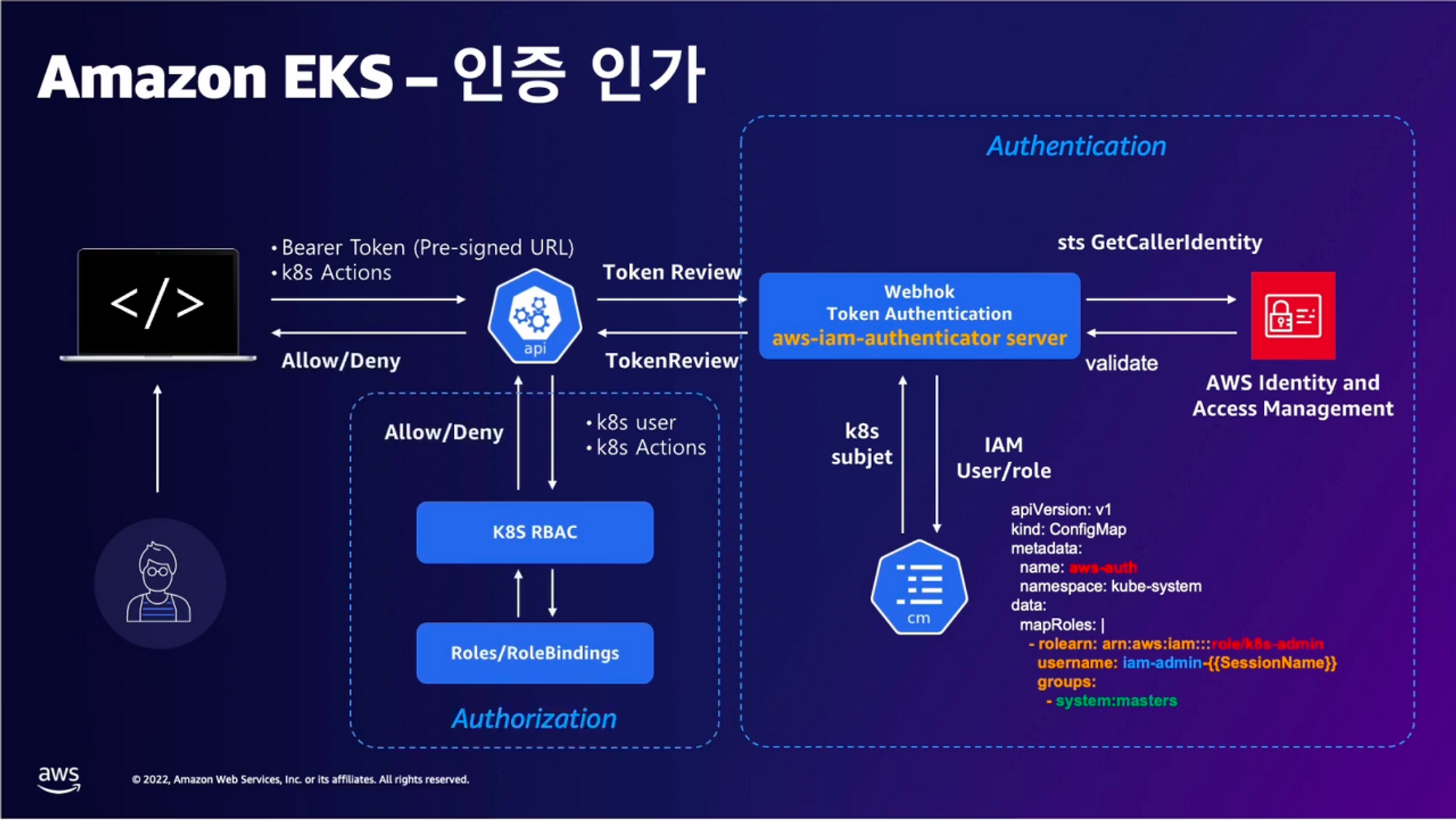 EKS API는 Token Review 를 Webhook token authenticator에 요청 ⇒ (STS GetCallerIdentity 호출) AWS IAM 해당 호출 인증 완료 후 User/Role에 대한 ARN 반환