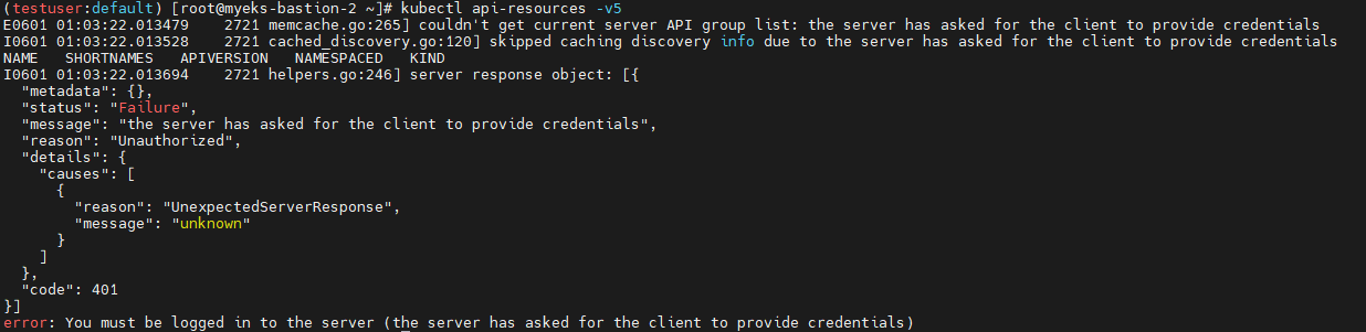 - [myeks-bastion] testuser 의 Group 변경(system:masters → system:authenticated)으로 RBAC 동작 확인