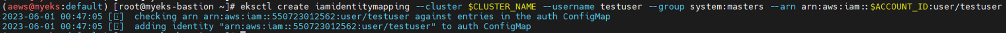 eksctl create iamidentitymapping --cluster $CLUSTER_NAME --username testuser --group system:masters --arn arn:aws:iam::$ACCOUNT_ID:user/testuser