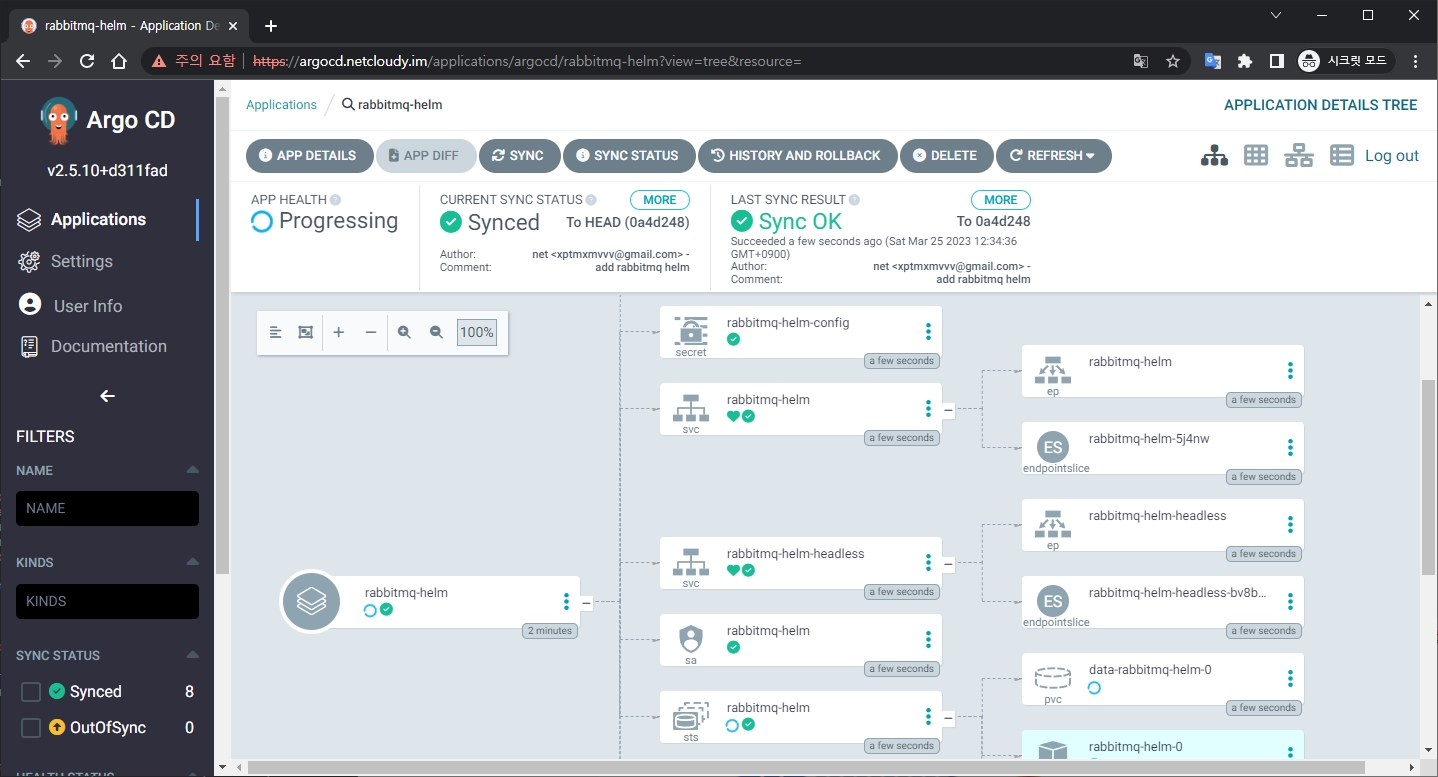 Sync를 수행하며 우리가 연동해둔 gitlab의 rabbit-mq helm chart 내용(ClusterIP -> LoadBalancer)으로 쿠버네티스의 배포 환경을 구성하려고 한다.