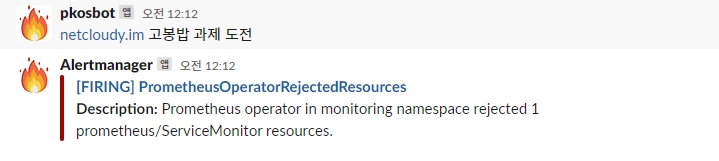 ## alertmanager-0 : 사전에 정의한 정책 기반(예: 노드 다운, 파드 Pending 등)으로 시스템 경고 메시지를 생성 후 경보 채널(슬랙 등)로 전송
