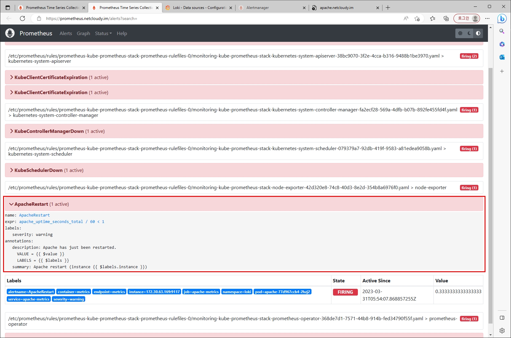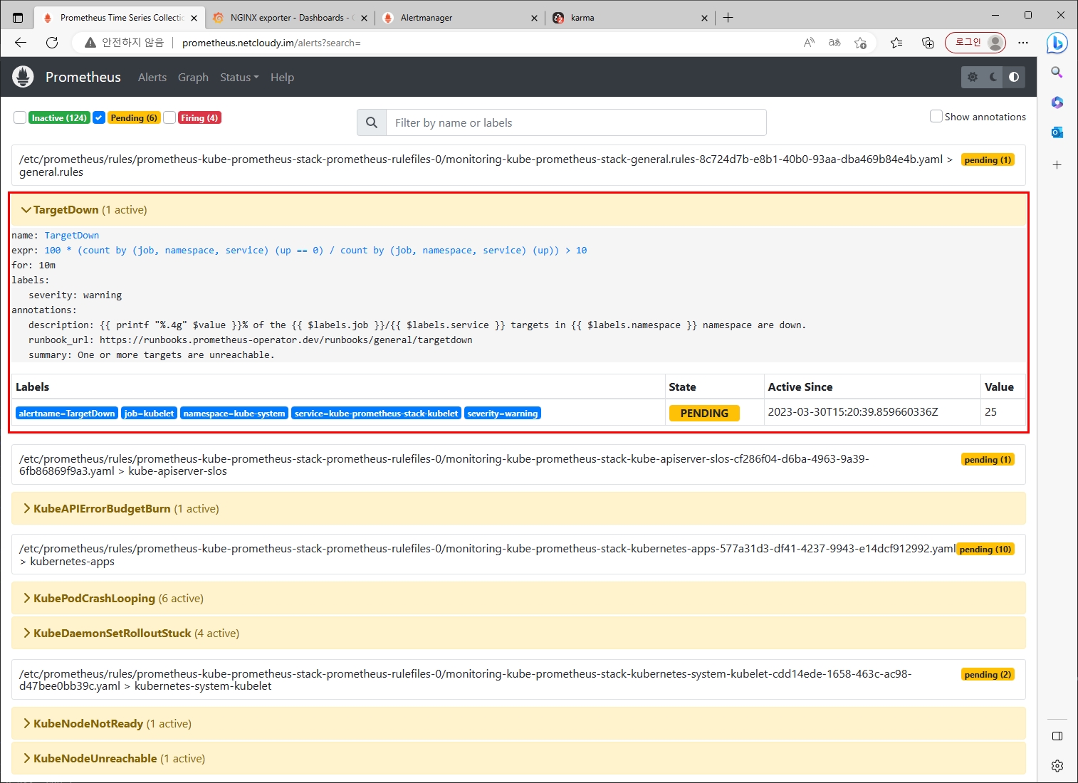 Awesome Prometheus alerts 를 참고해서 스터디에서 배우지 않은 Alert Rule 생성 및 적용 후 관련 스샷을 올려주세요