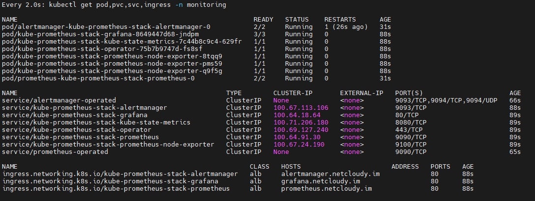 watch kubectl get pod,pvc,svc,ingress -n monitoring