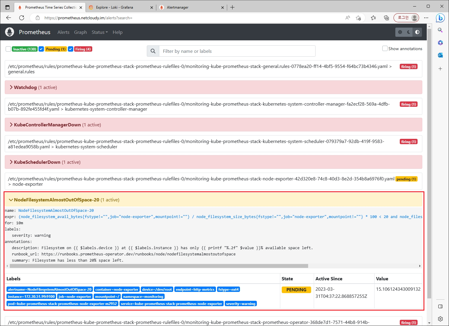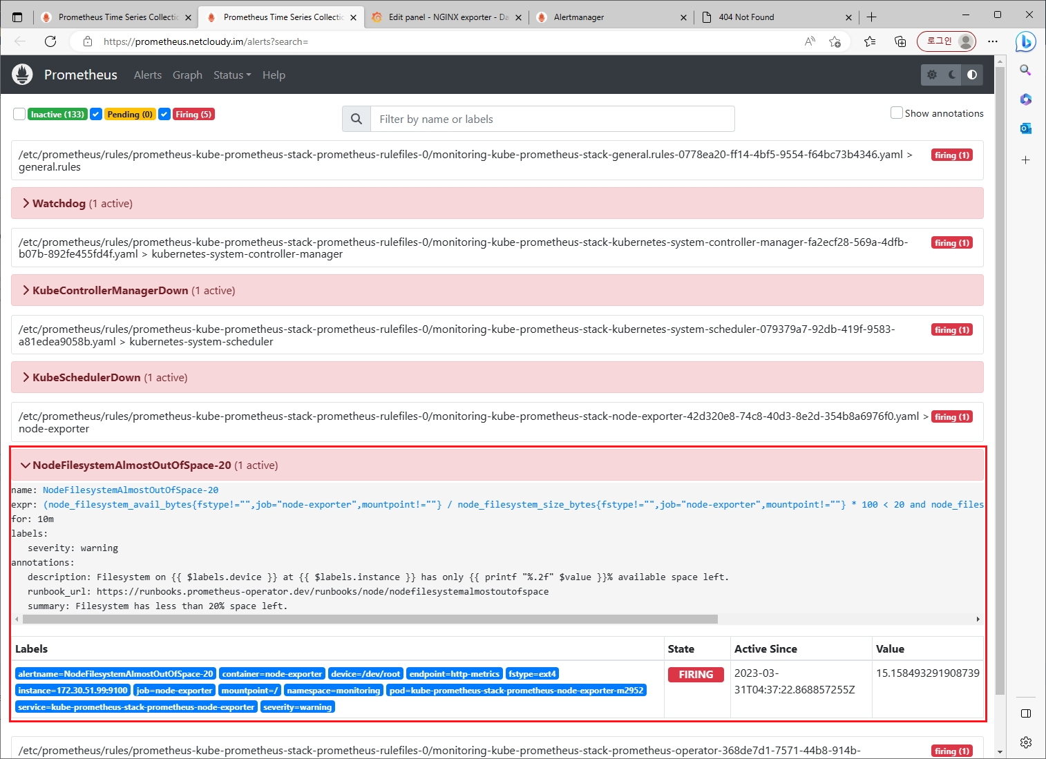 책 367~372페이지 - 사용자 정의 prometheusrules 정책 설정 : 파일 시스템 사용률 80% 초과 시 시스템 경고 발생시키기