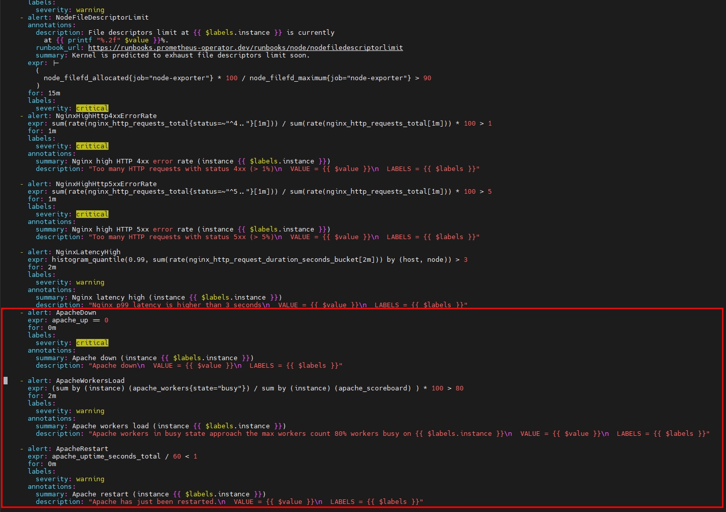 description: "Apache down\n VALUE = {{ $value }}\n LABELS = {{ $labels }}"