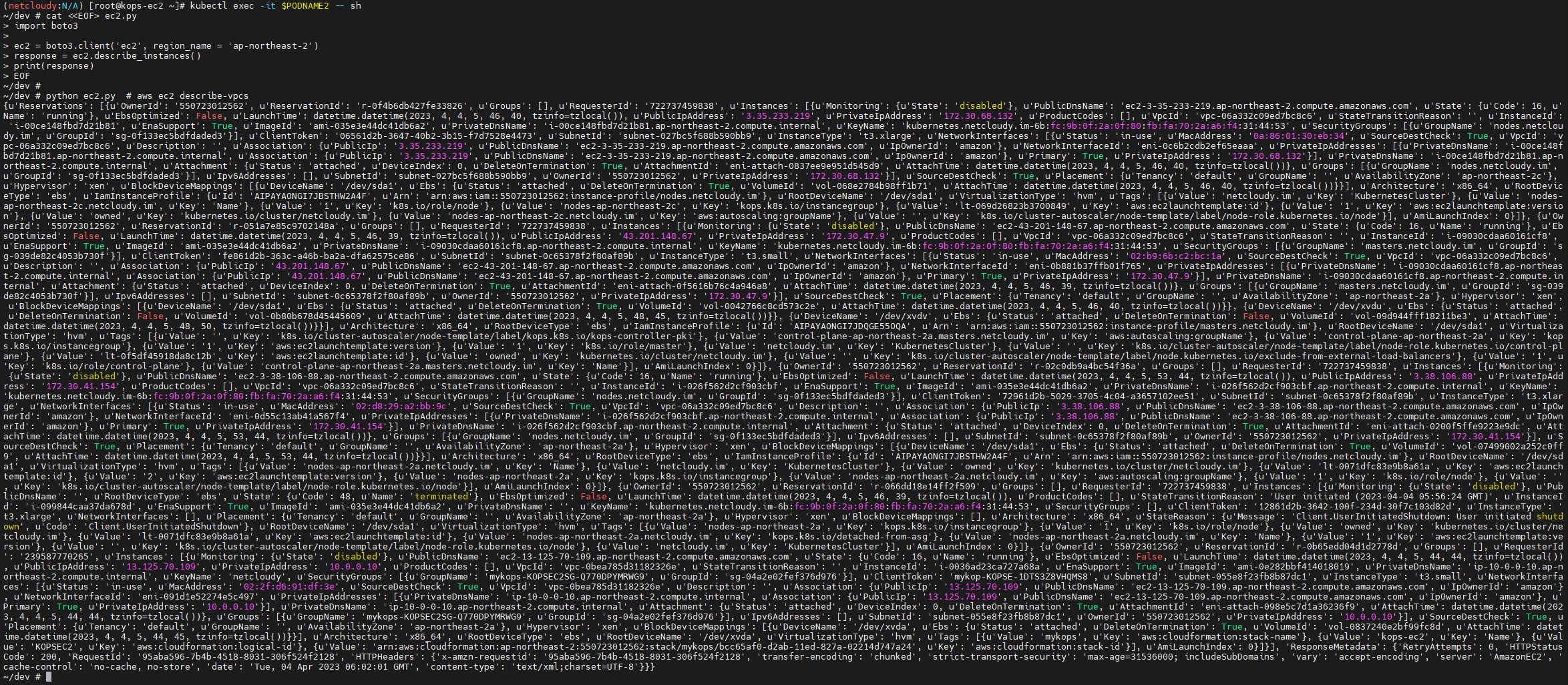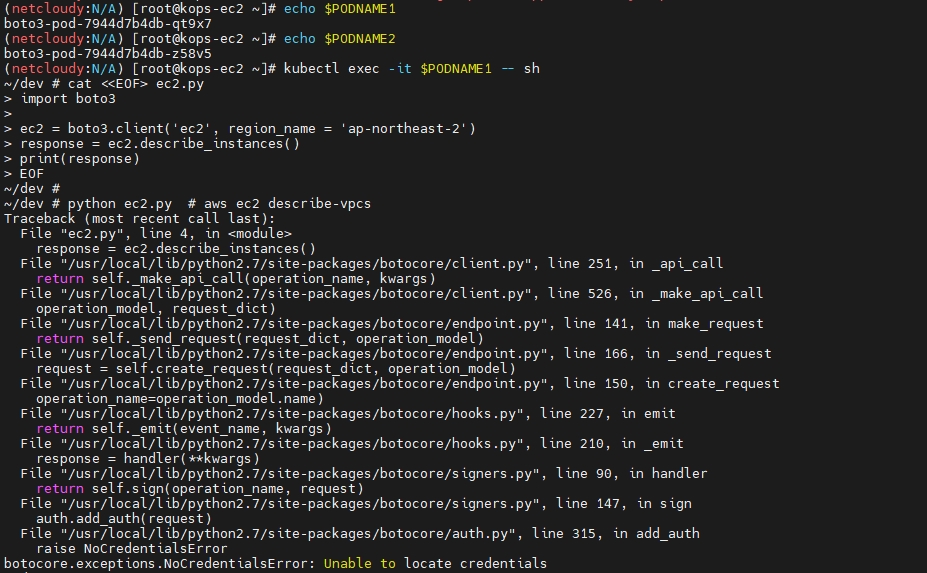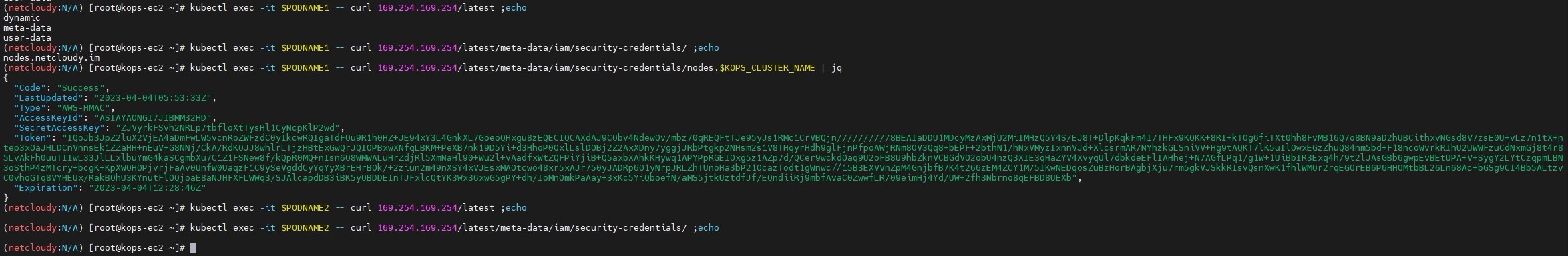 kubectl exec -it $PODNAME2 -- curl 169.254.169.254/latest/meta-data/iam/security-credentials/nodes.$KOPS_CLUSTER_NAME | jq