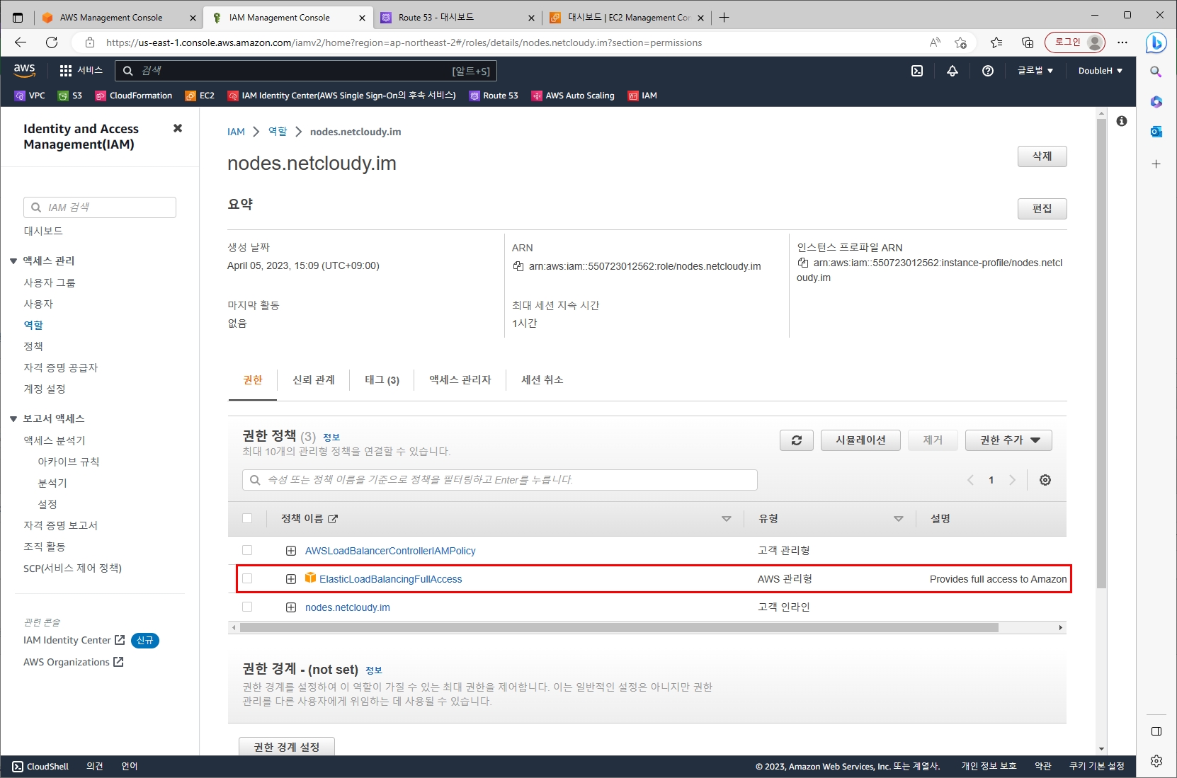 node의 EC2가 가진 권한 정책에 ELB에 대한 Full 권한 정책을 추가해주었다.