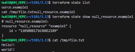 null_resource.example1 (local-exec): Executing: ["bash" "-c" " echo Hello!! > file.txt\n echo $ENV >> file.txt\n"]