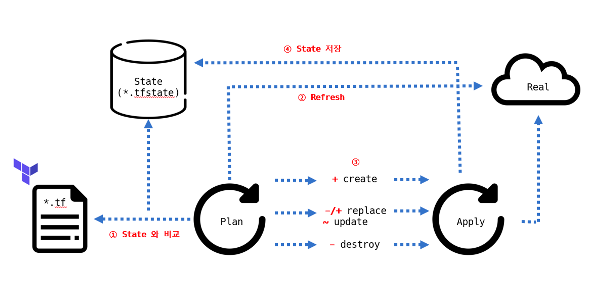 - State는 테라폼만을 위한 API로 정의할 수도 있다. Plan을 실행하면 암묵적으로 refresh 동작을 수행하면서 리소스 생성의 대상(클라우드 등)과 State를 기준으로 비교하는 과정을 거친다.