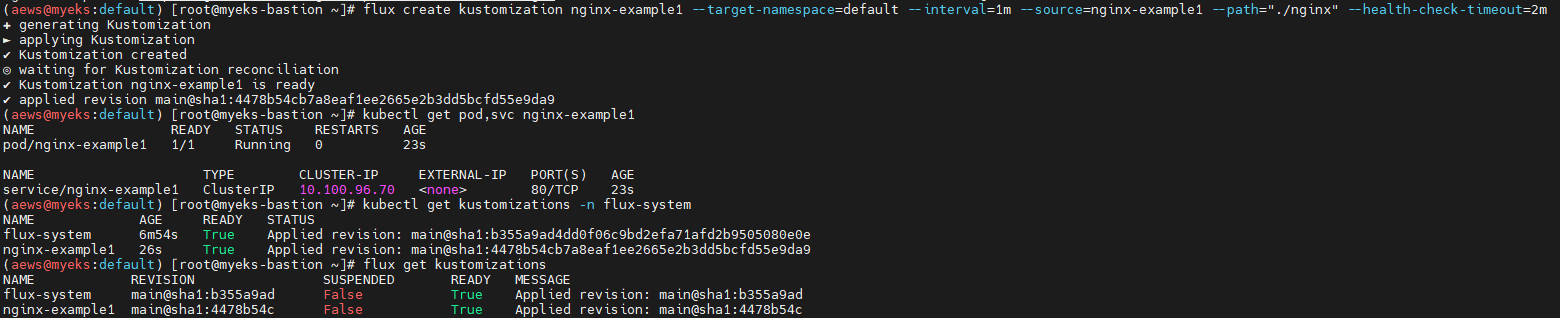 flux create kustomization nginx-example1 --target-namespace=default --interval=1m --source=nginx-example1 --path="./nginx" --health-check-timeout=2m