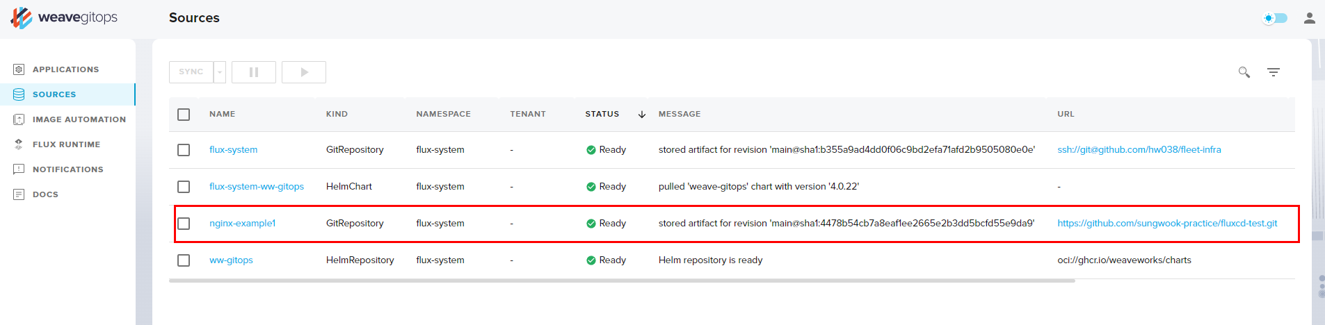 - flux 애플리케이션 생성 : 유형(kustomization) , 깃 소스 경로( —path ./nginx) → gitops 웹 대시보드에서 확인