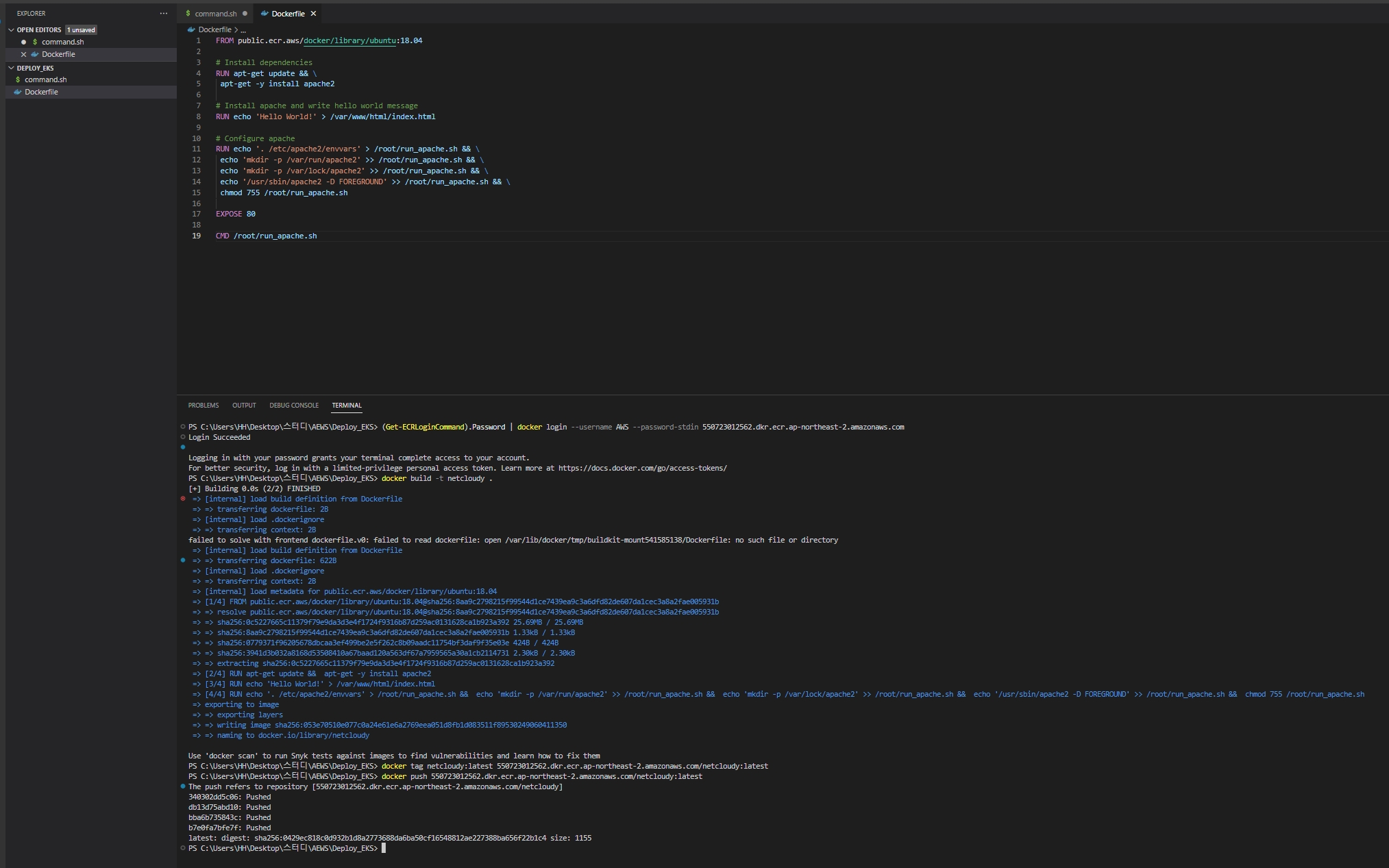 Private ECR 로그인 및 Dockerfile이 준비가 됐으면, 아래와 같이 작업한다.