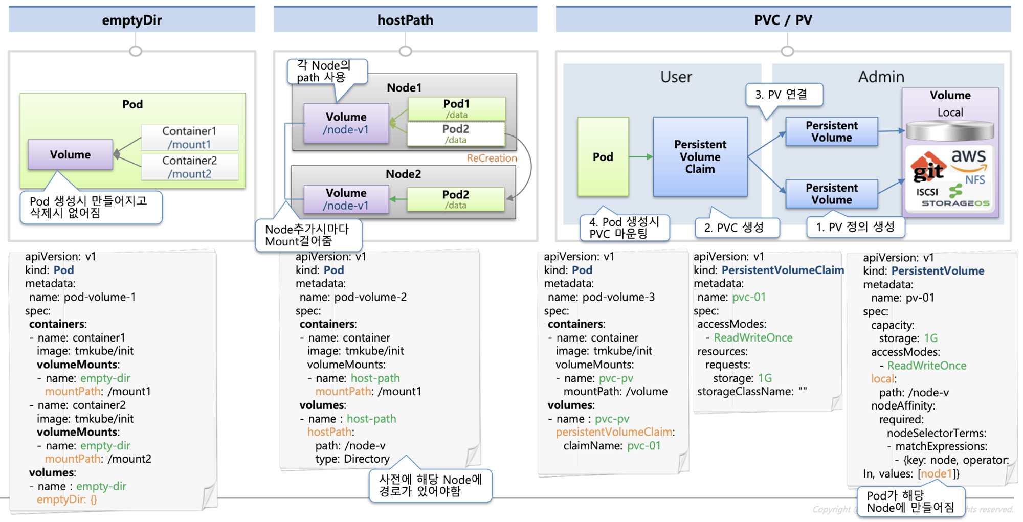 - 볼륨 : emptyDir, hostPath, PV/PVC