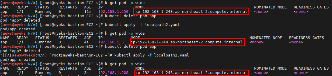 - 당연히 node에 귀속된 디스크 자원을 쓰는 형태로 볼륨을 잡았기 때문에 데이터(볼륨)가 있는 node로 pod를 배포