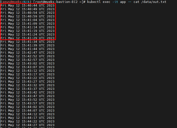 # 워커노드 중 현재 파드가 배포되어 있다만, 아래 경로에 out.txt 파일 존재 확인