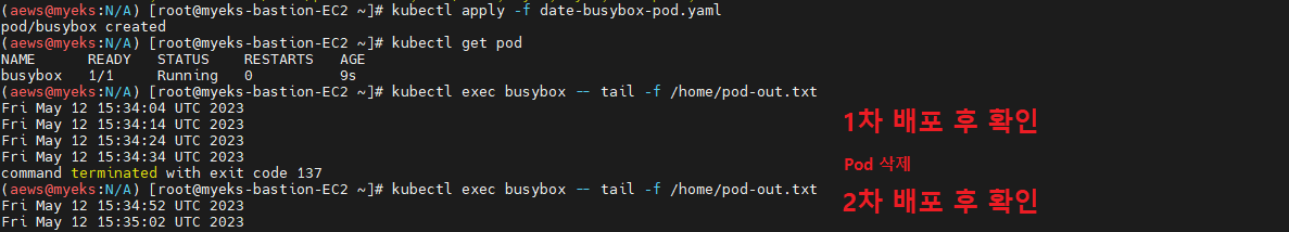 # 파드 삭제 후 다시 생성 후 파일 정보 확인 > 이전 기록이 보존되어 있는지?