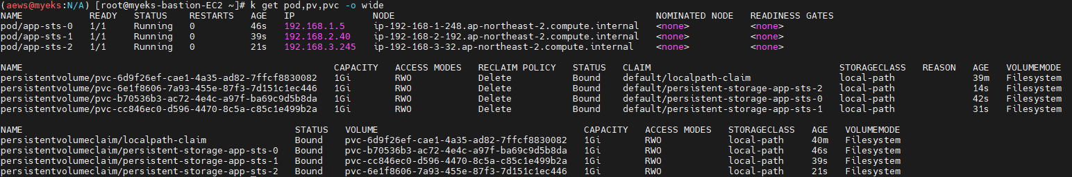 대신 데이터는 당연히 3개 파드가 각각 다른 영구적볼륨에 저장된다.