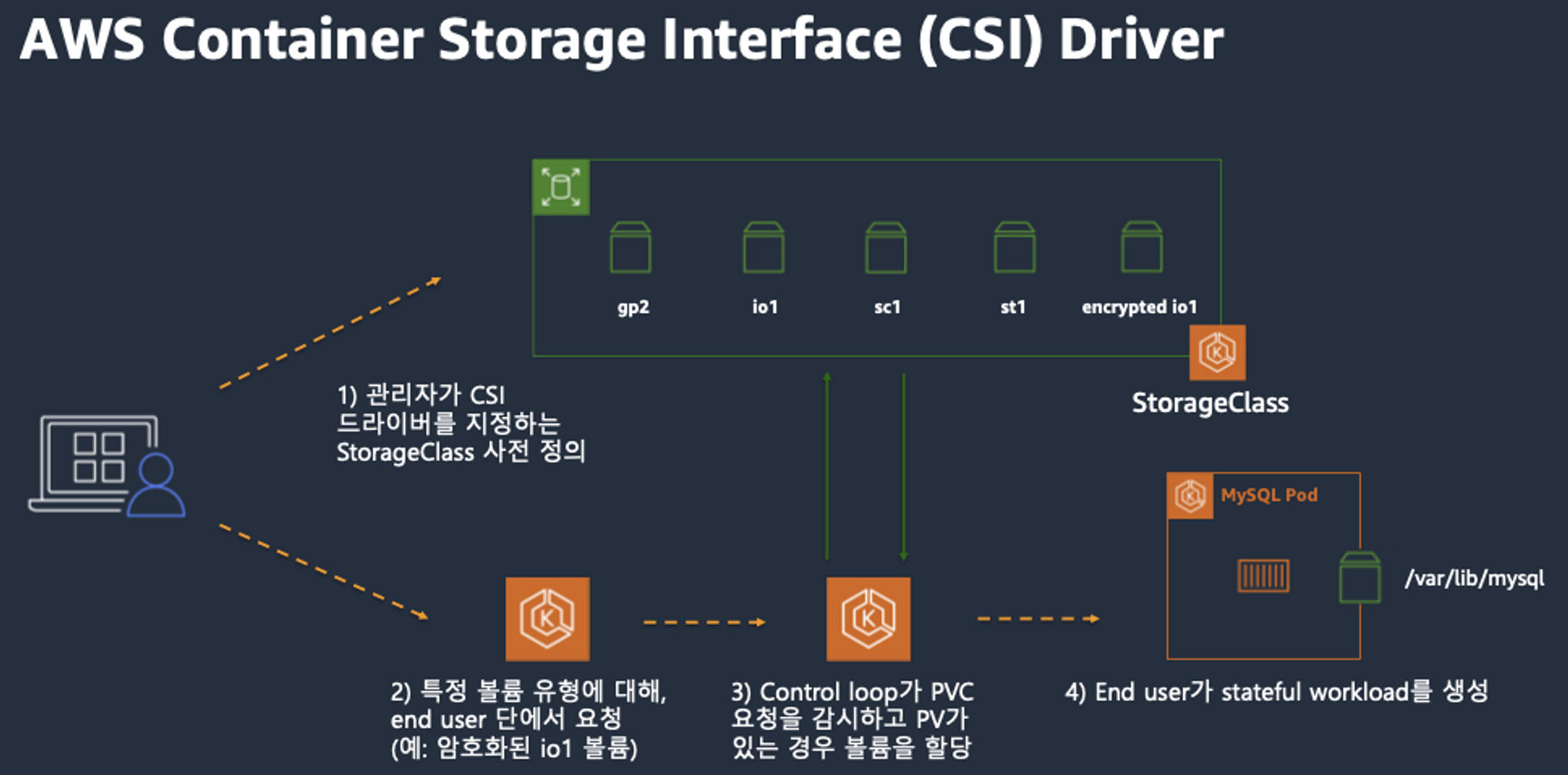 - 왼쪽 DaemonSet으로 배포된 node Pod은 AWS API를 사용하여 Kubernetes node (EC2 instance)에 EBS volume을 attach