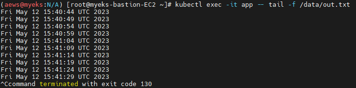 ssh ec2-user@$N1 tail -f /opt/local-path-provisioner/pvc-f1615862-e4cd-47d0-b89c-8d0e99270678_default_localpath-claim/out.txt