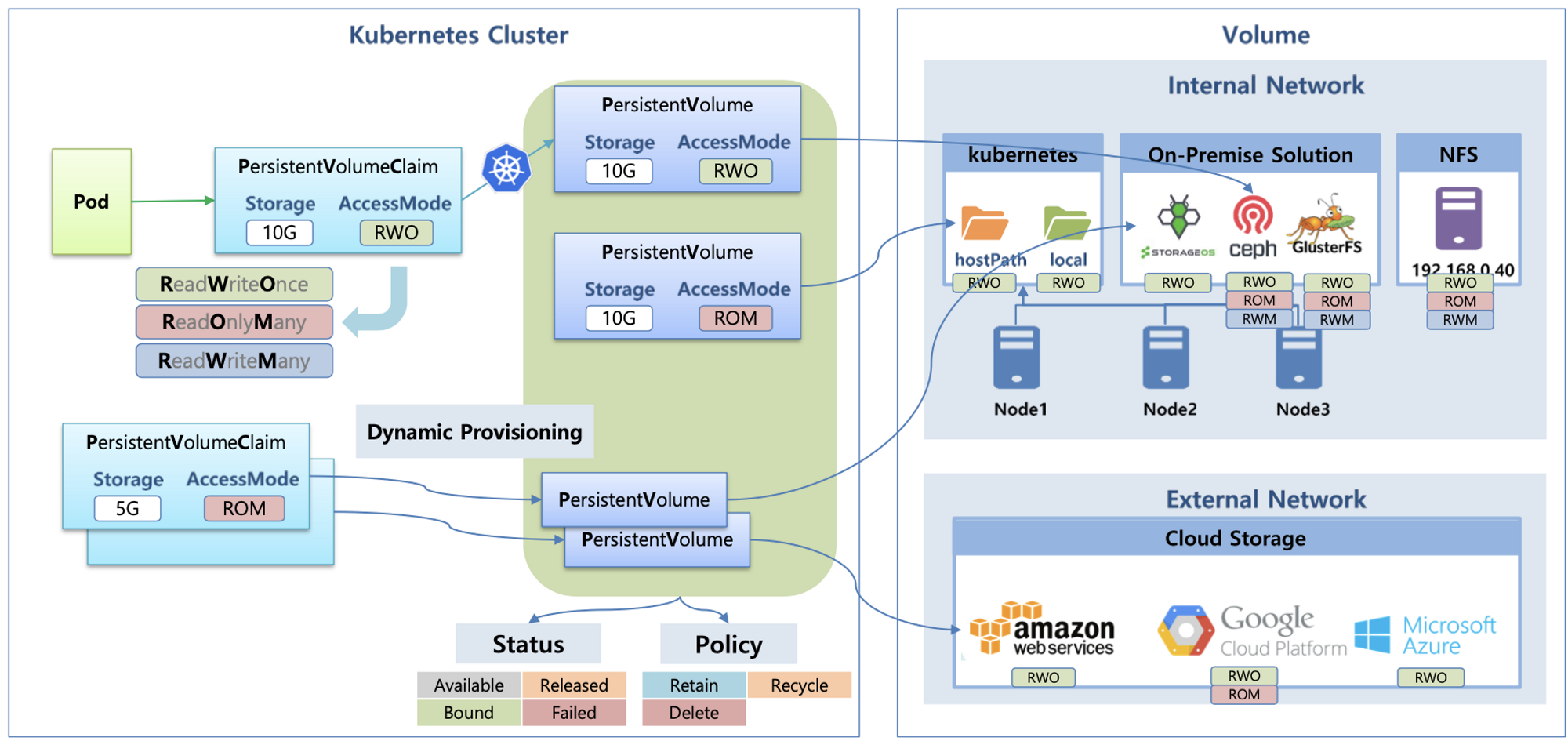 - 다양한 볼륨 사용 : K8S 자체 제공(hostPath, local), 온프렘 솔루션(ceph 등), NFS, 클라우드 스토리지(AWS EBS 등)