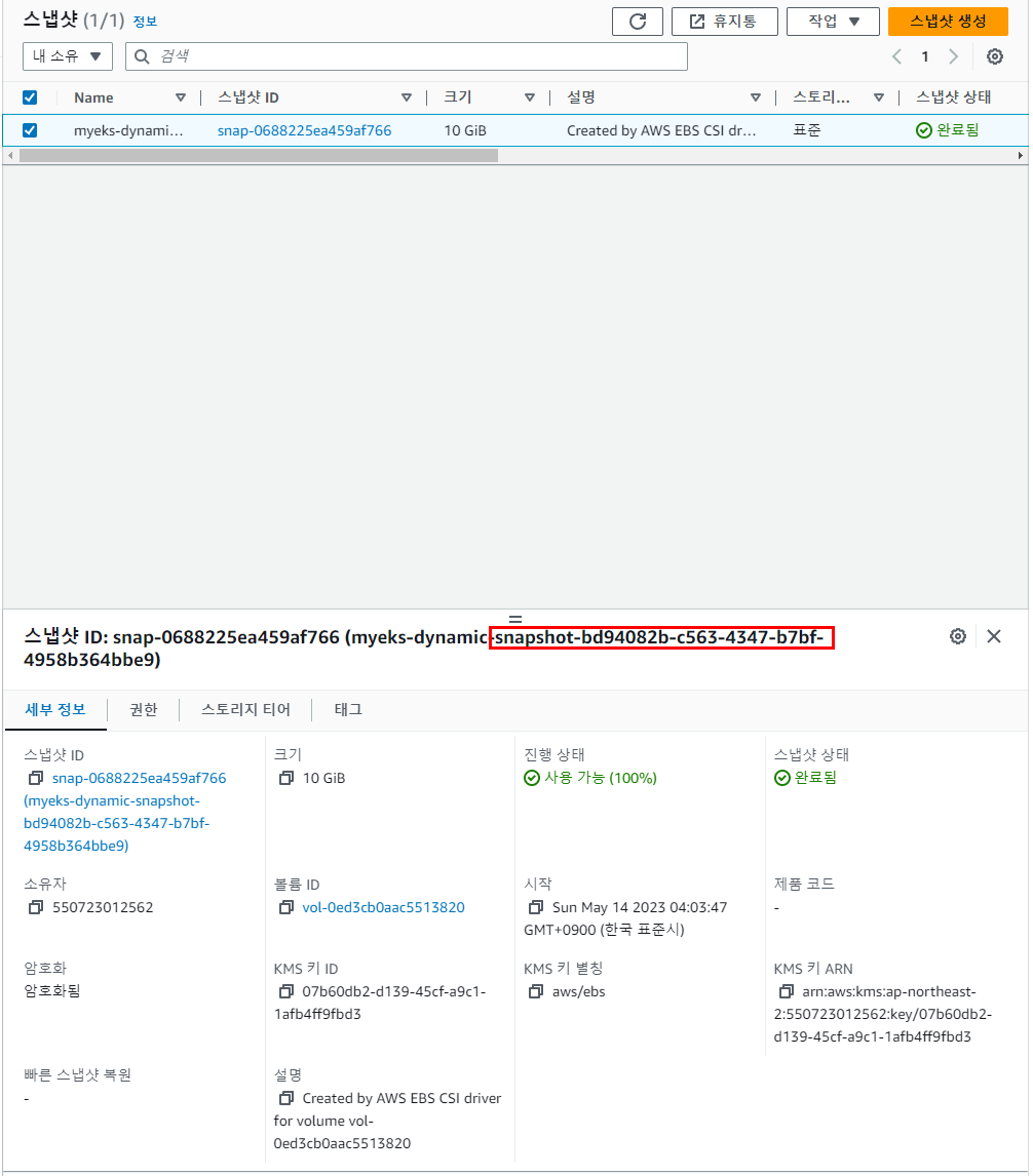# VolumeSnapshot 생성 : Create a VolumeSnapshot referencing the PersistentVolumeClaim name >> EBS 스냅샷 확인