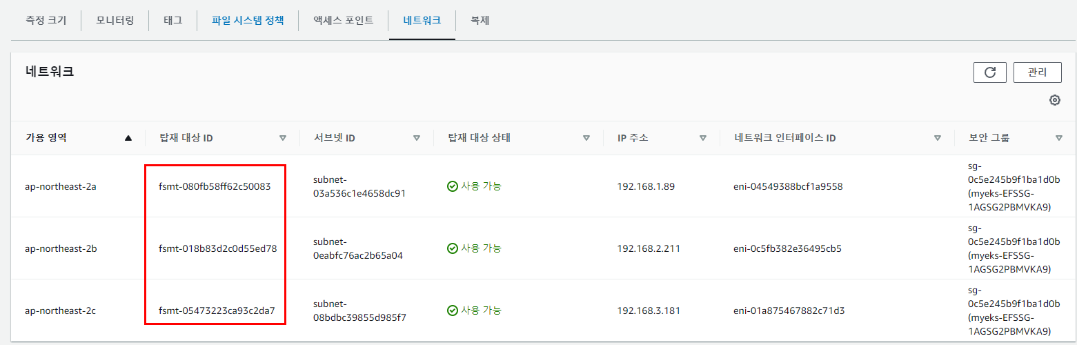 - AWS → EFS → 파일 시스템 : 네트워크 → 탑재 대상 ID 확인