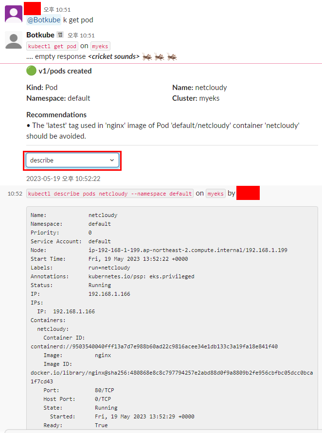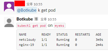 botkube는 특히나 kubectl 명령어에 익숙하지 않은 개발자들에게 제공하면 logs, describe, get, top 정도는 선택박스에서 고를 수 있기에 간단하게 문제를 확인하기에는 도움이 될 것 같다.