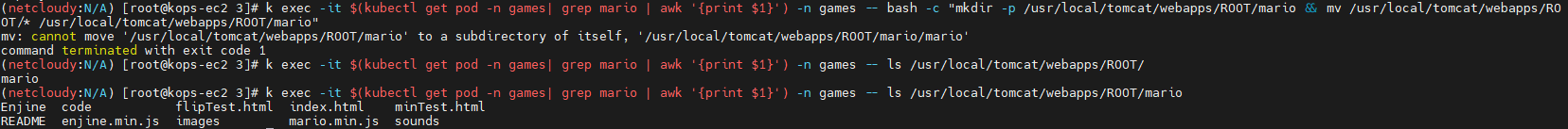 k exec -it $(kubectl get pod -n games| grep mario | awk '{print $1}') -n games -- bash -c "mkdir -p /usr/local/tomcat/webapps/ROOT/mario && mv /usr/local/tomcat/webapps/ROOT/* /usr/local/tomcat/webapps/ROOT/mario"