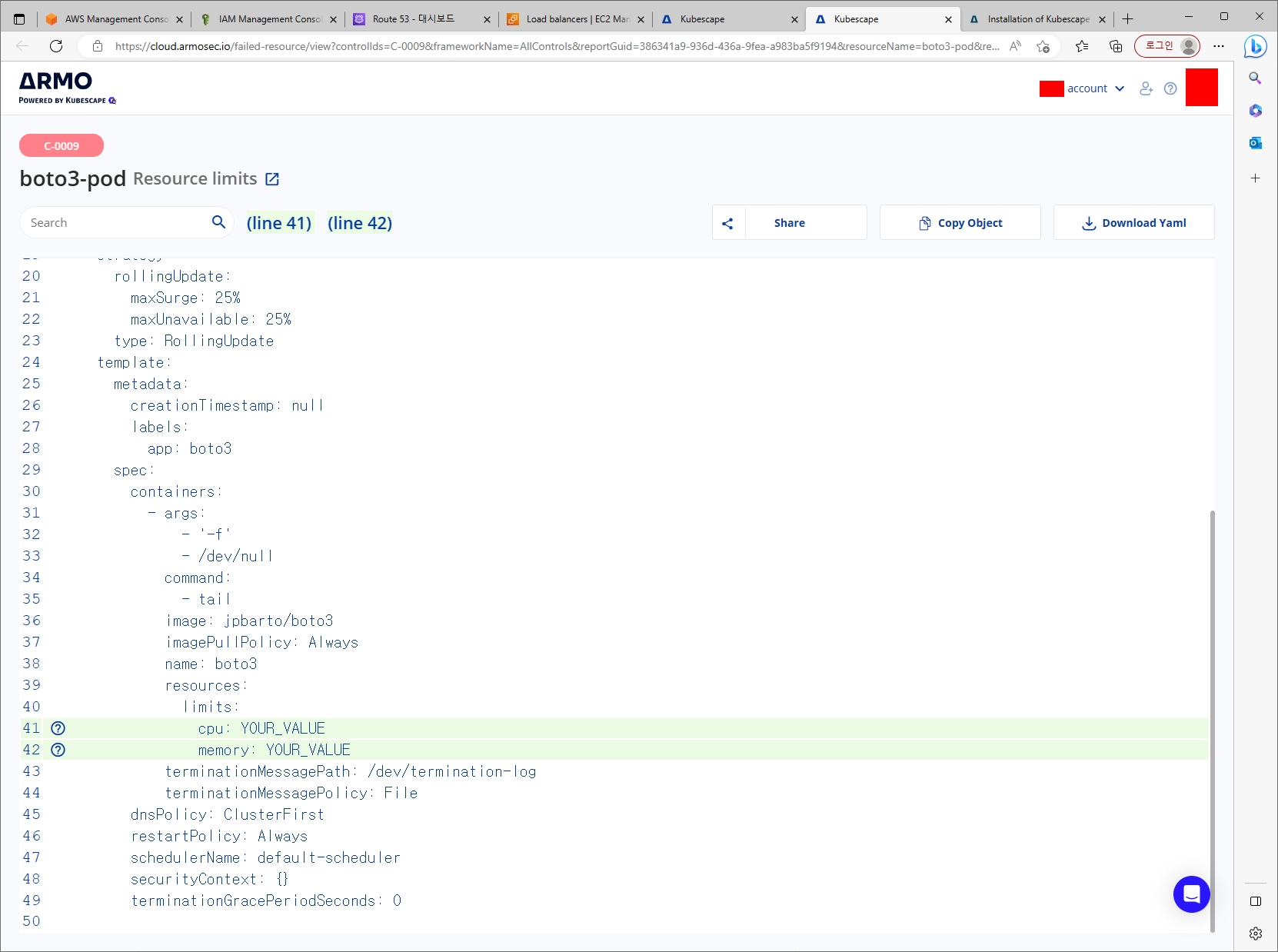 아래는 그 중 Resource limits(C-0009) 항목에 적발된 리스트다.