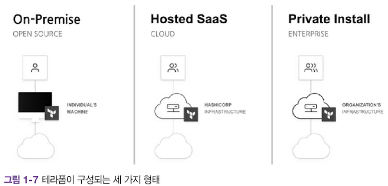 - Private Install : Terraform Enterprise로 불리는 서버 설치형 구성 환경으로, 기업의 사내 정책에 따라 프로비저닝 관리가 외부 네트워크와 격리 - 링크