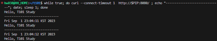 hw038@HH_HOME:~/t101$ while true; do curl --connect-timeout 1 http://$PIP:8080/ ; echo "------------------------------"; date; sleep 1; done