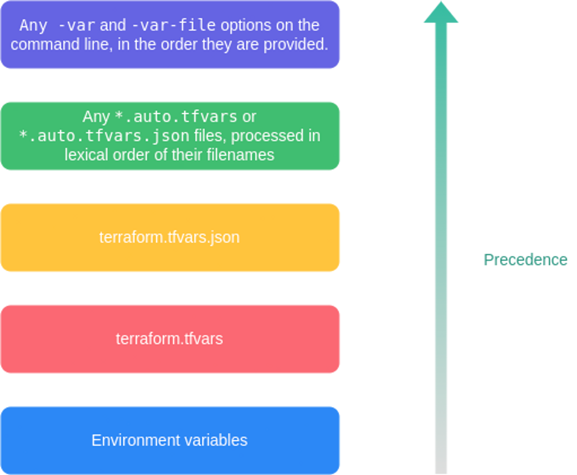 - *.auto.tfvars , *.auto.tfvars.json , 그리고 apply 시 -var=my_var=var7 or 파일로 -var-file="var9.txt" 입력 하는 것들 모두