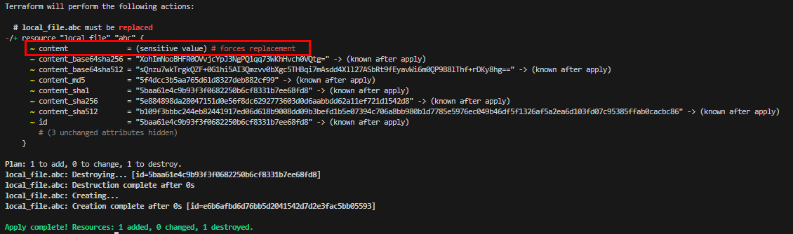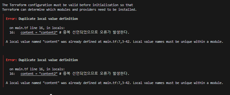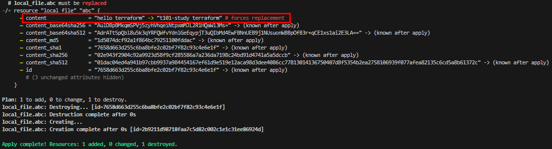 - 실행 : main.tf의 content 내용 값으로 local.content를 참조하며, 해당 값은 다른 테라폼 구성 파일에 있지만 실행 시점에는 마치 하나의 구성 파일 처럼 올바로 표기되는 것을 확인할 수 있다.